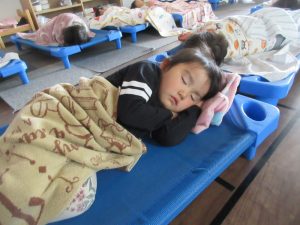 サイレンが鳴ると先生の掛け声とともにお部屋の真ん中に集まり、