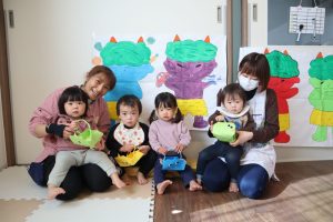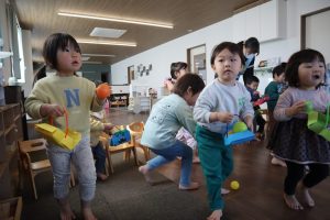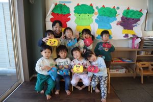 紙芝居の後は、いよいよ豆まき。怒りんぼ鬼に泣き虫鬼、野菜嫌い等…みんなの心の中にはどんな鬼が棲んでいるかな?様々な鬼たちに向かって、豆に見立てたボールを投げました( •̀ ω •́ )✧