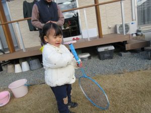 大きなラケットに羽、ゴルフボールを持ってみたりお庭を散策していました😊♪