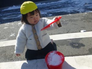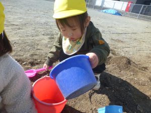 スコップやバケツを「かーしーて!」「どうぞ♪」とやりとりする姿がみられました😊♪