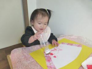 ピンクの絵の具でペタペタとスタンプ♬