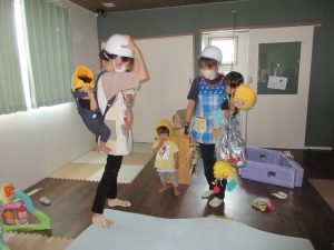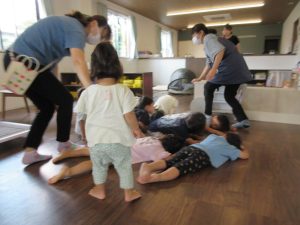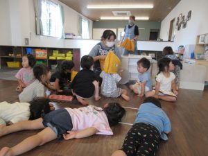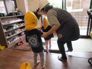 地震からの火災を想定しての訓練。先生のお話をよく聞いて姿勢を低くし、まずはだんご虫ポーズ!