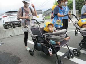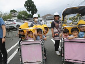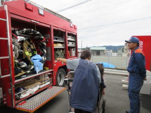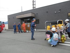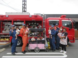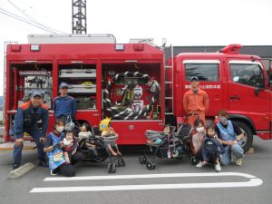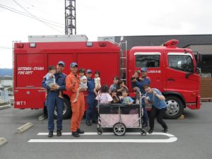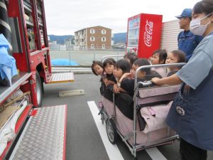 消防車も近くで見学させてもらい、子どもたちは大興奮ヾ(≧▽≦*)o消火ホースや現場で着用する服等、普段は見られないものも見せてもらいました♪「わ~!かっこいい!」「消防士さんになる~」と口々に思いを伝えてくれた2歳児さんでした♡