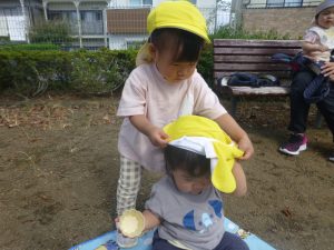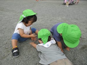 「これは何かな?」と葉っぱや木の実に興味を持ち始める子や、お友だちのお世話をしてあげようという気持ちが芽生えてきた子もいます(●ˇ∀ˇ●)