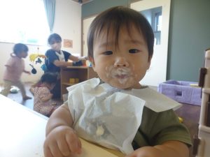 朝のおやつを上手に食べお口の周りがお髭になっています😊