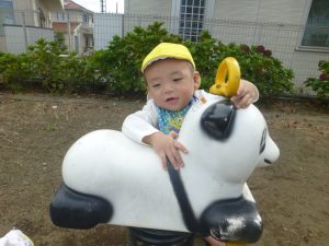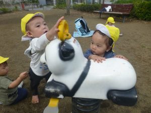 スプリング遊具が気になって手を伸ばしてみたりつかまり立ちをしたり