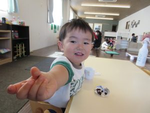 今日のおやつ牛乳とレーズン!トドラーズさんはエプロンがなくても、汚さずに上手に食べられるようになりました✨外遊びに行く前のパワーチャージです(´~`)モグモグ