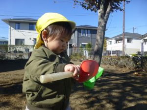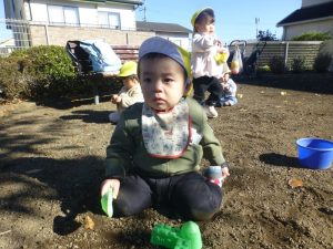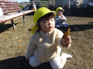 砂遊びをしたり、落ち葉を拾って「これは何だ?」と不思議そうに眺めています♪