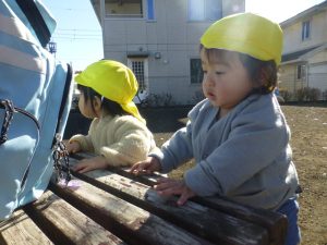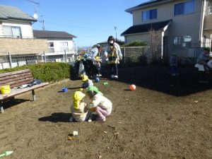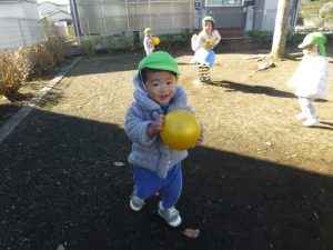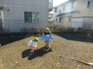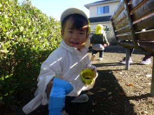 おやつの後は公園に遊びに行きました。枯れ葉がたくさん落ちていて、上から降らせてみたり、バケツに集めているお友だちもいました🍂