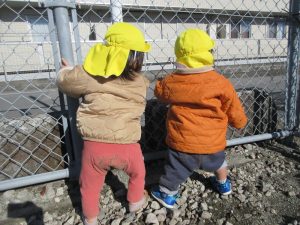 フェンスにつかまったり、先生に支えてもらいながら歩いたり