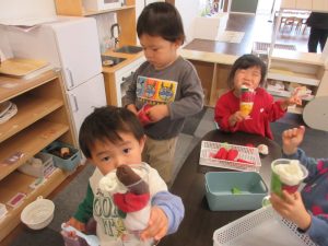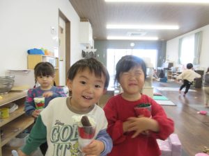 いちご、チョコ、クリームをいれて、はいどうぞ♪