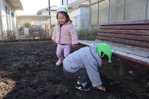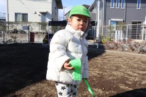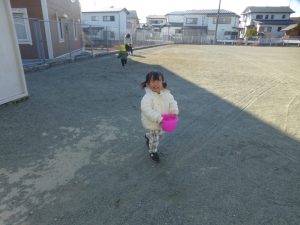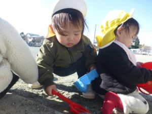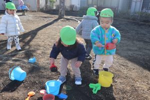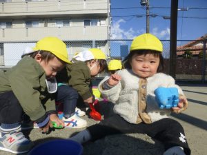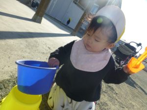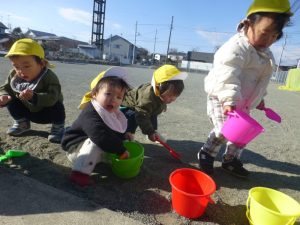 バケツやスコップを持って砂あそびをしたり、小さな石や大きな石を見つけて手に持ったり♬