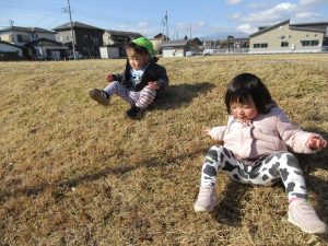 芝生の広場では、お友だちと一緒に芝生の坂を滑ってみたり