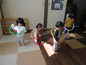 カラーボードをハンドルに見立ててドライブに出かけたり、フープを使って遊びました。