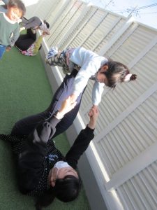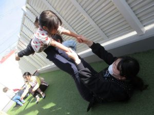テラスでリトミックや先生の足に乗ってビューン!!飛行機✈楽しそうです😊