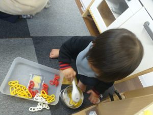 チェーンを上手にすくってお皿に入れたり、メルちゃんをおんぶして