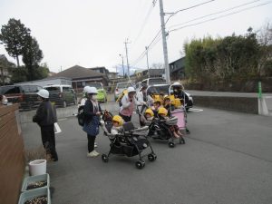 防災頭巾を被ってお隣の広場まで避難します。