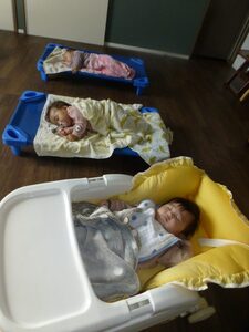 エンジェルクラスの子どもたち。寝る時には、抱っこでゆらゆらしてもらうと、うとうと・・・。かわいい寝顔を見せてくれます♡