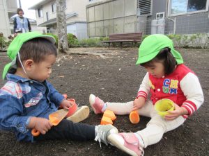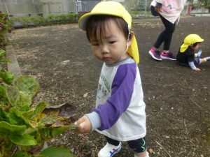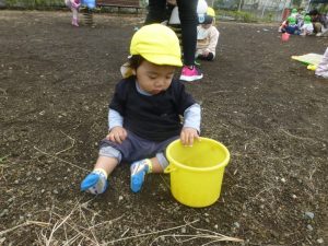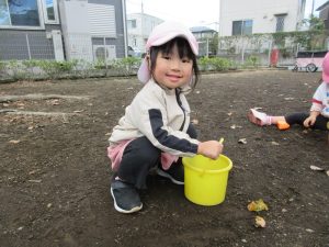 地面の土を集めたり、植木の葉っぱを触って「これは何かな?」と興味深々🎶